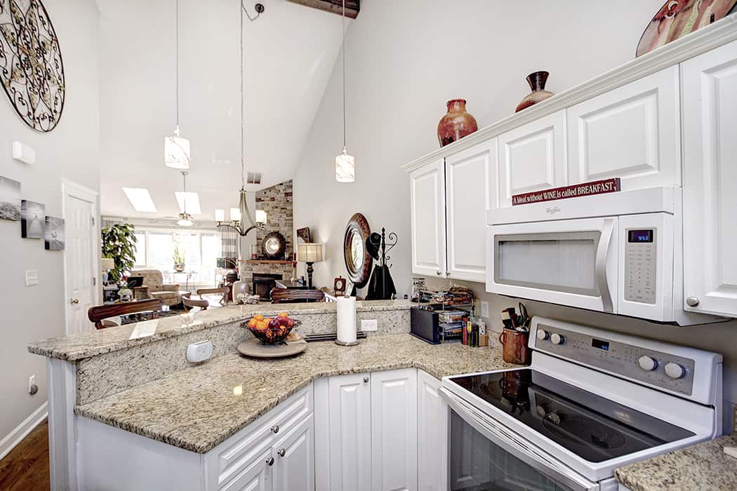 Fabulous features include hardwoods on the main level, tile in baths and carpet in bedrooms, completely renovated guest bath, renovated kitchen with granite countertops, stunning stone fireplace surround and all new lighting. Newer sunroom, exterior building (including trim) painted, 2016, HOA installed new front deck in 2016 and a beautiful water view (pond side).