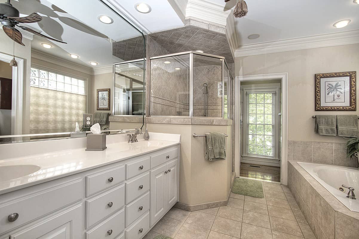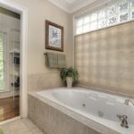 Luxurious MAIN LEVEL MASTER suite features large sitting bay area overlooking backyard and tray ceiling, highlighted with custom paint in neutral colors. Wood floors adorn the master suite leading to the luxury bath with whirlpool tub and large updated shower. There are two enormous walk-in closets in the master as well.