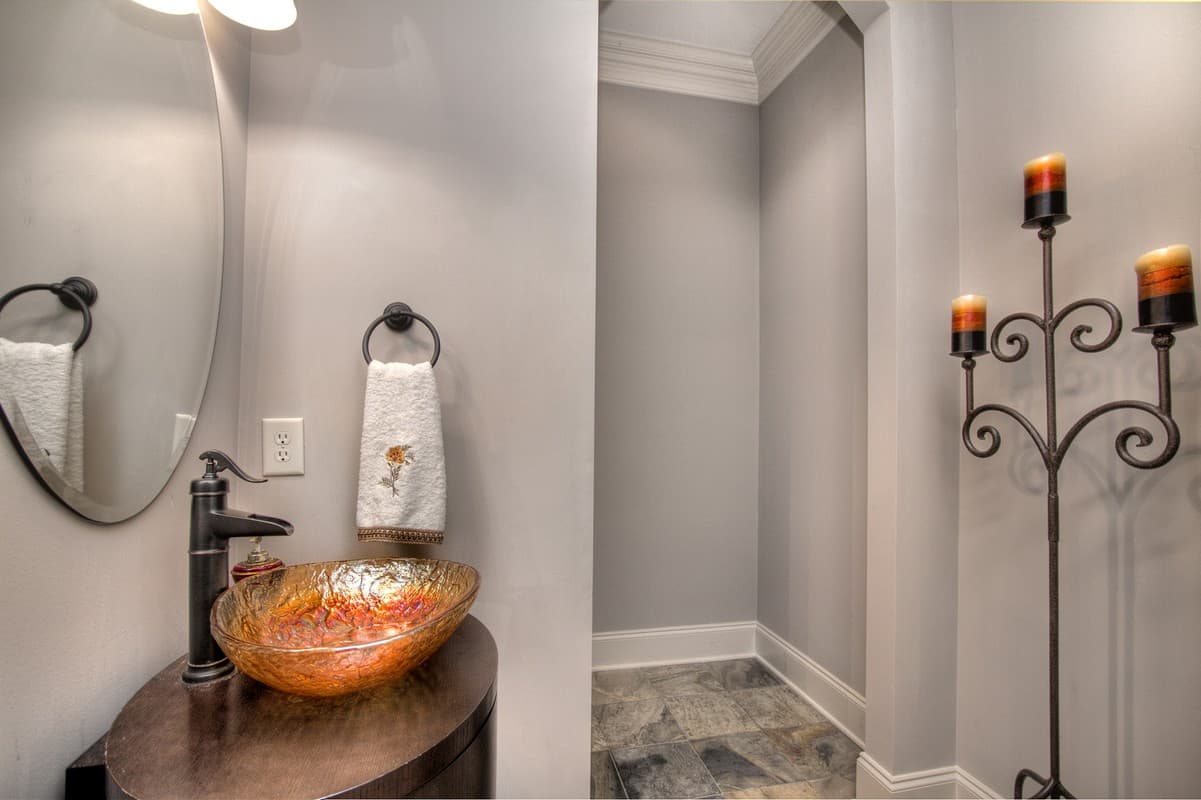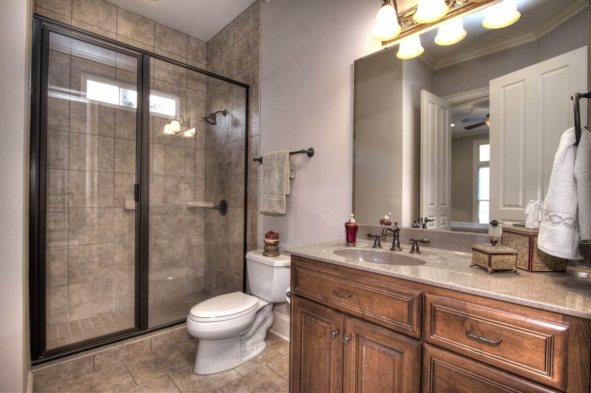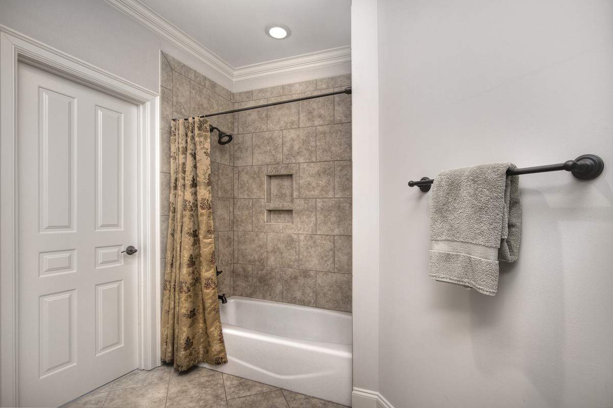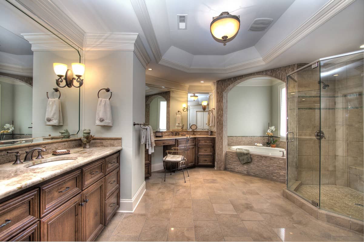 Picture yourself getting ready for your day each morning in a simply luxurious master bath that completes the master suite and is floored with travertine tile, Italian marble countertops, and decorative glass tile accents that features a regal stone arch and surround showcasing the 6’ jetted tub, an oversized shower with dual shower heads, double sinks and spacious counter areas. A separate water closet provides you with complete privacy.