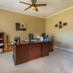 Past the stairs is the open living areas – the kitchen, breakfast and family rooms. The kitchen features stainless, granite, lots of cabinets, a desk area and 4 OVENS – yes, FOUR! This kitchen is any chef’s dream! The large family room features a fireplace and access to the fabulous backyard.