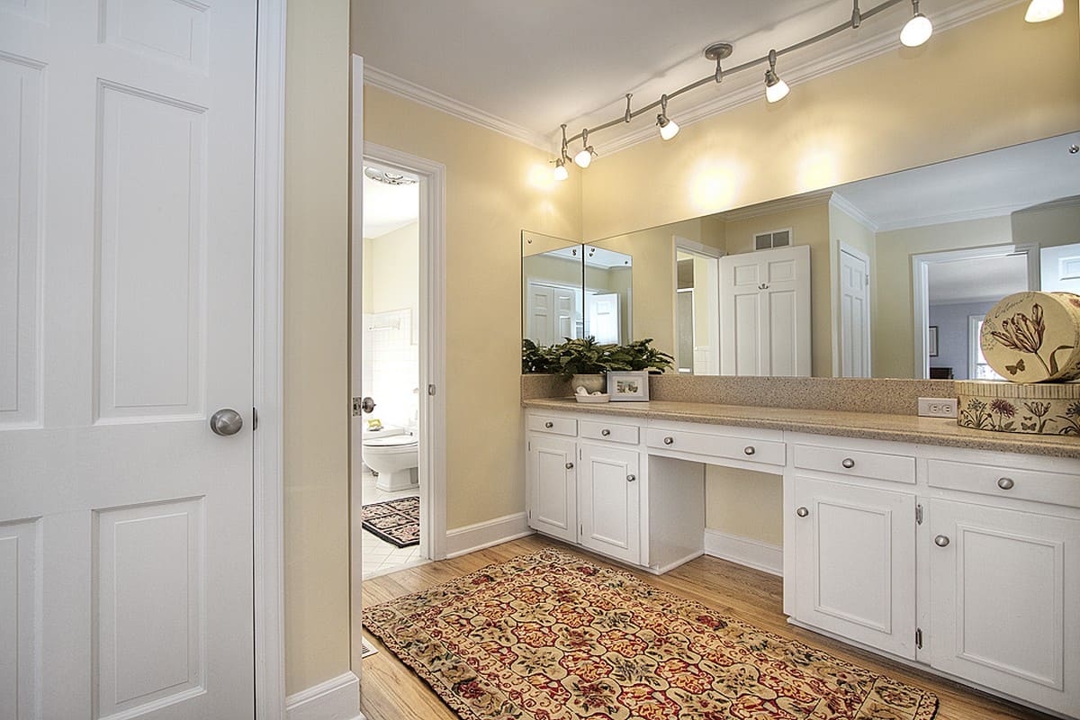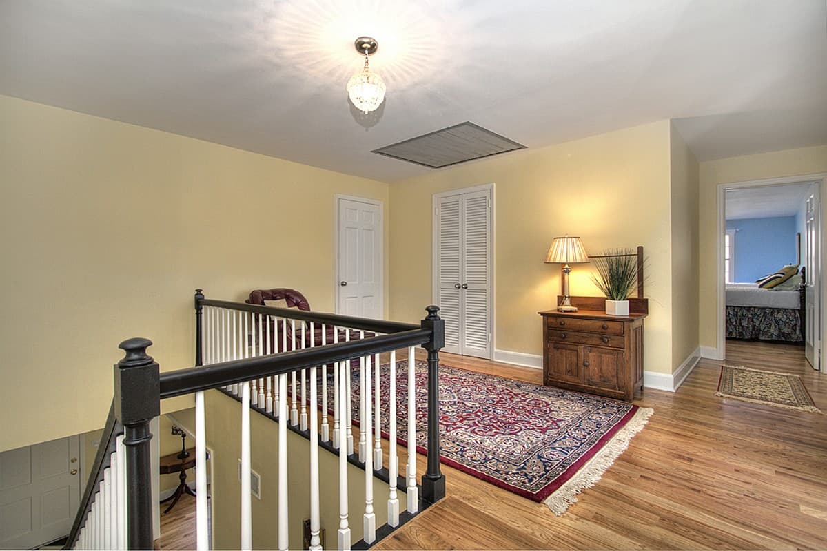 The front porch overlooks the stream and bridge in the front with lush, mature hardwoods and flowering trees–what a view! The MASTER is located ON THE MAIN level and is enormous. The dressing area with 2 closets leads to the master bath.