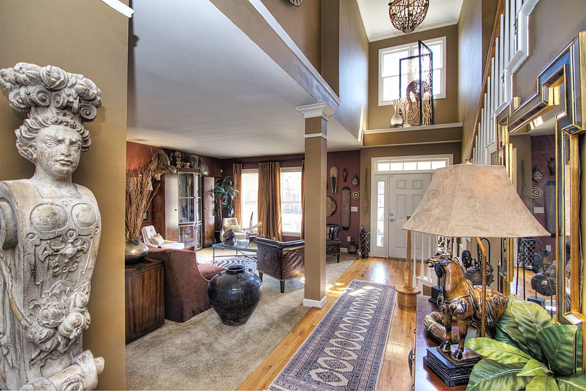 The open floorplan with soaring 2-story family room that boasts a fireplace, flanked by built-ins, adjacent to kitchen with large eat-in breakfast nook and kitchen island.  The formal areas are in the front of the home beside the 2-story foyer.