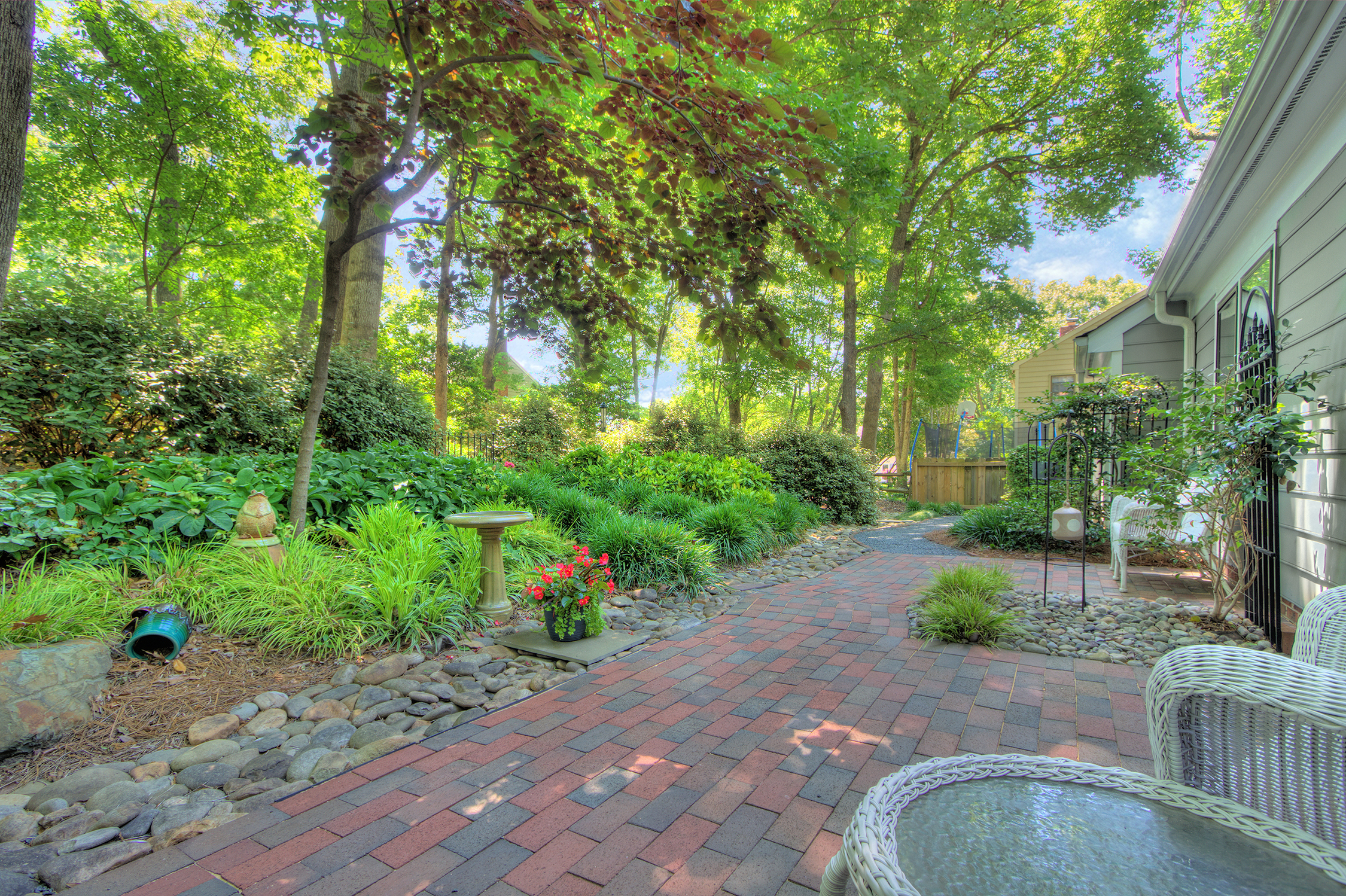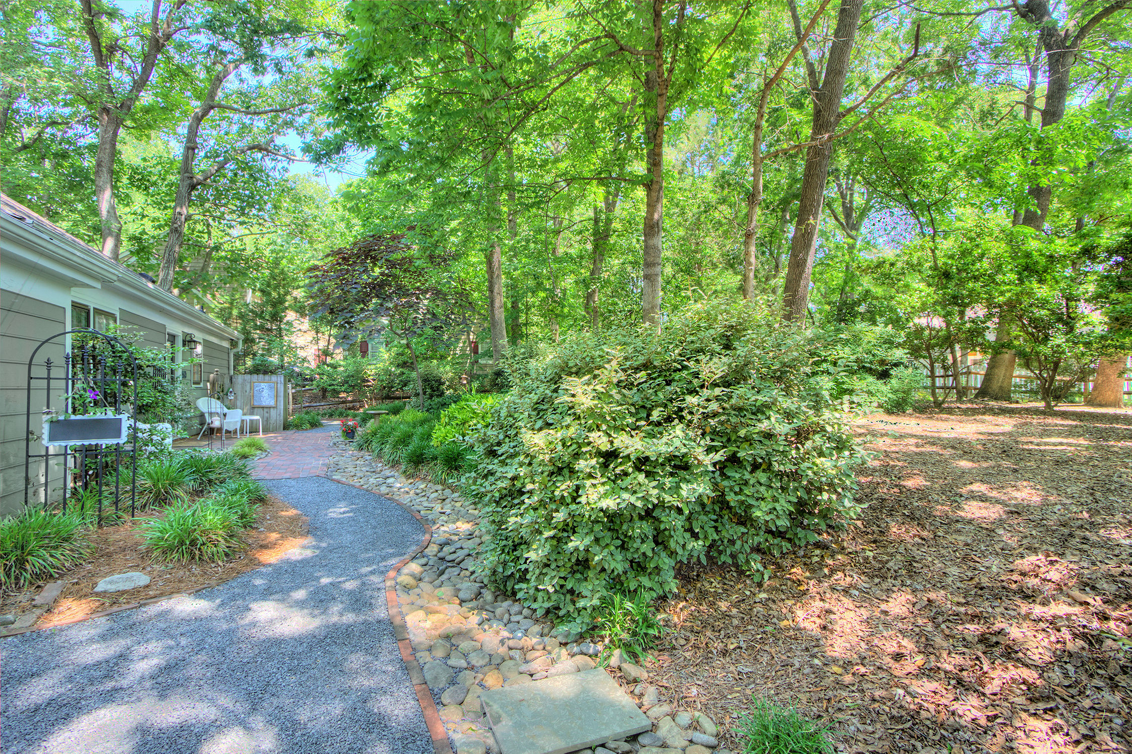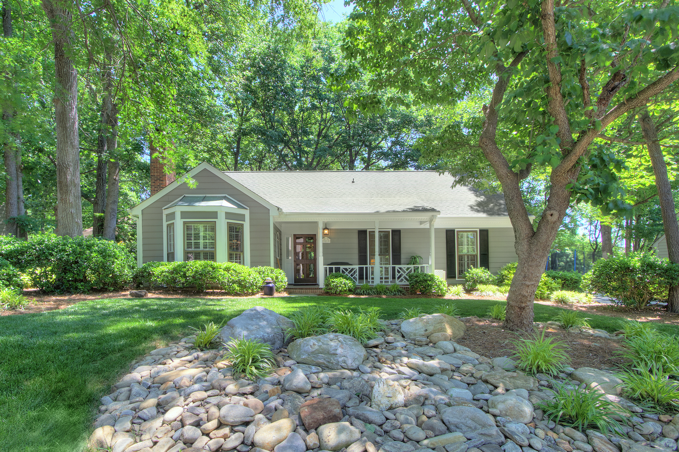 Charming 3 BR RANCH with impeccably landscaped front & rear yards with large patio, surrounded by incredibly stunning, sanctuary setting. Private, fenced backyard in popular Cameron Wood community in South Charlotte. Low maintenance landscaping gives you more time to enjoy the neighborhood amenities just across the street – including pool, tennis, pond & playground! Updated kitchen & baths, wood flooring throughout – simply beautiful upgrades! Large primary bedroom with large walk-in closet, unusual for this era home, spacious secondary bedrooms & living areas. Living room has fireplace and electric logs (that also provide heat). Eat-in kitchen overlooks stunning backyard.