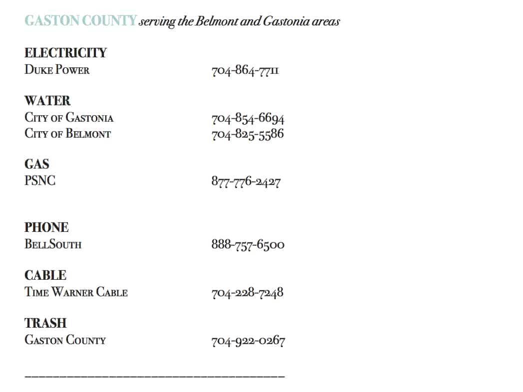 A week or two prior to Closing on your home, you will want to contact your utility company to have the service transferred from the current homeowner to the new one. Generally, in Mecklenburg County, the seller will need to be the first to initiate the transfer through the utility providers.
