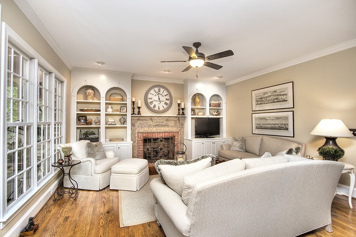 The great room and large eat-in kitchen is in the back of the house, adjacent to a welcoming screened porch overlooking the beautiful backyard. The greatroom features a fireplace with gas logs, flanked by built-ins. The open floorplan provides wonderful opportunities for entertaining.