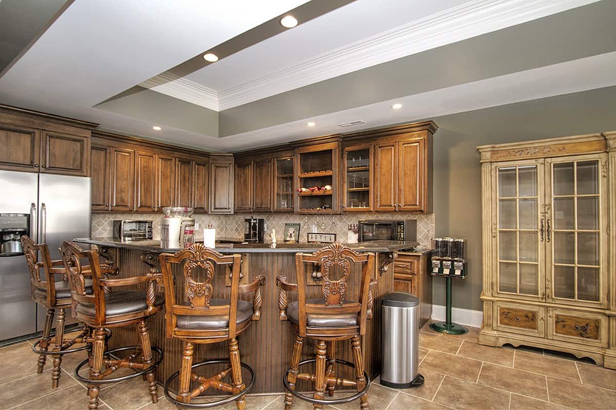 Stairs leading to the fully finished, walk-out basement are hardwood. The carpet has been removed for flooring replacement of the buyer’s choice. The basement includes a second master suite, a theatre room, large den with stone fireplace and custom built-ins, adjacent to a large kitchen and dining or billiard area. The kitchen boasts a large island with plenty of seating, custom cabinetry and treyed ceiling with heavy millwork and tile flooring. 7th bedroom or office space with treyed ceiling is also located in the basement.