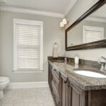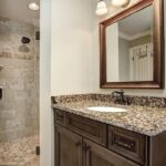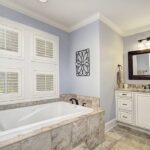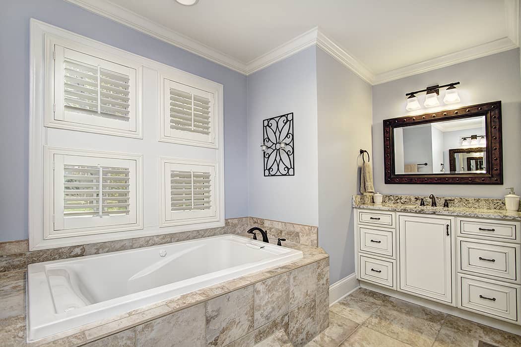 MAIN LEVEL MASTER SUITE with luxury bath that has been completely updated with custom tile and cabinets, separate Jacuzzi tub and walk-in shower with frameless glass door, separate vanities with granite tops and oil-rubbed bronze fixtures.