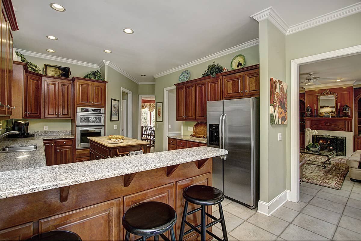 The updated kitchen includes cherry cabinets, granite countertops, gas cooktop and large eat-in area, also overlooking gorgeous backyard. Access to the deck and paver terrace from the kitchen and family rooms.