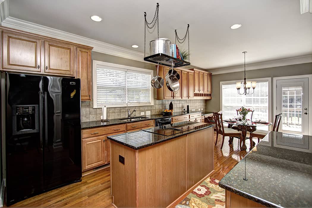 Follow the gleaming HARDWOODS past the wrought iron encased staircase, into the back of the home with large family room that boasts a centerpiece fireplace and a large wall of windows that allow the sunshine to pour in. The family room is also opened to the incredible kitchen. TONS of cabinet space, island, bar and desk areas – more countertop space than you’ll know what to do with! Space-saving nook desk and large breakfast room overlooks the large deck, patio and flat, fenced-in backyard.